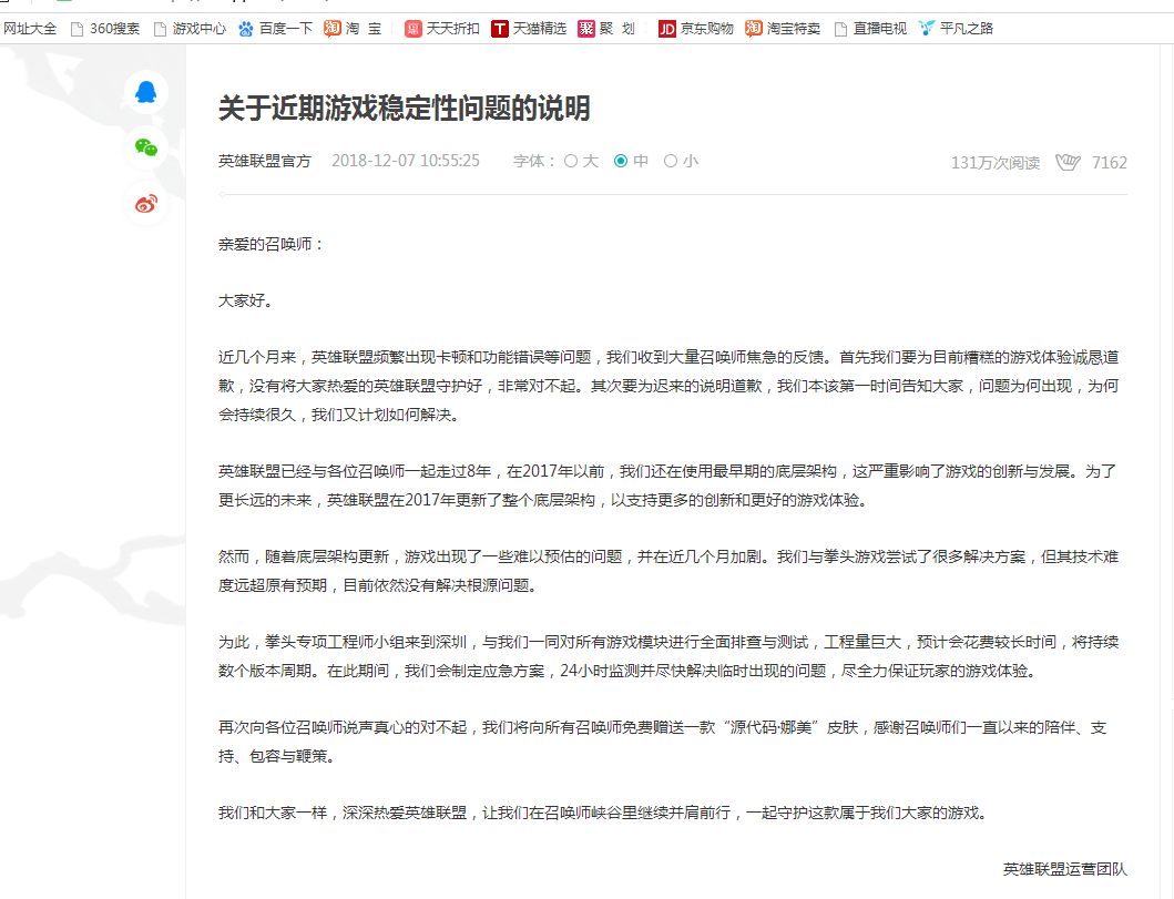 对了最近LOL可以领取一个娜美的永久源代码皮肤,主要因为最近LOL服务器不稳定而答谢玩家的!